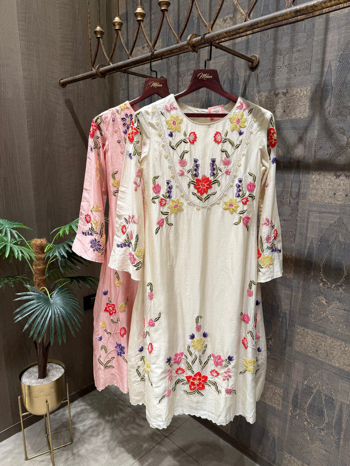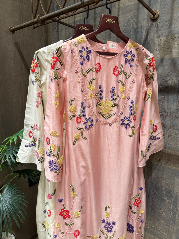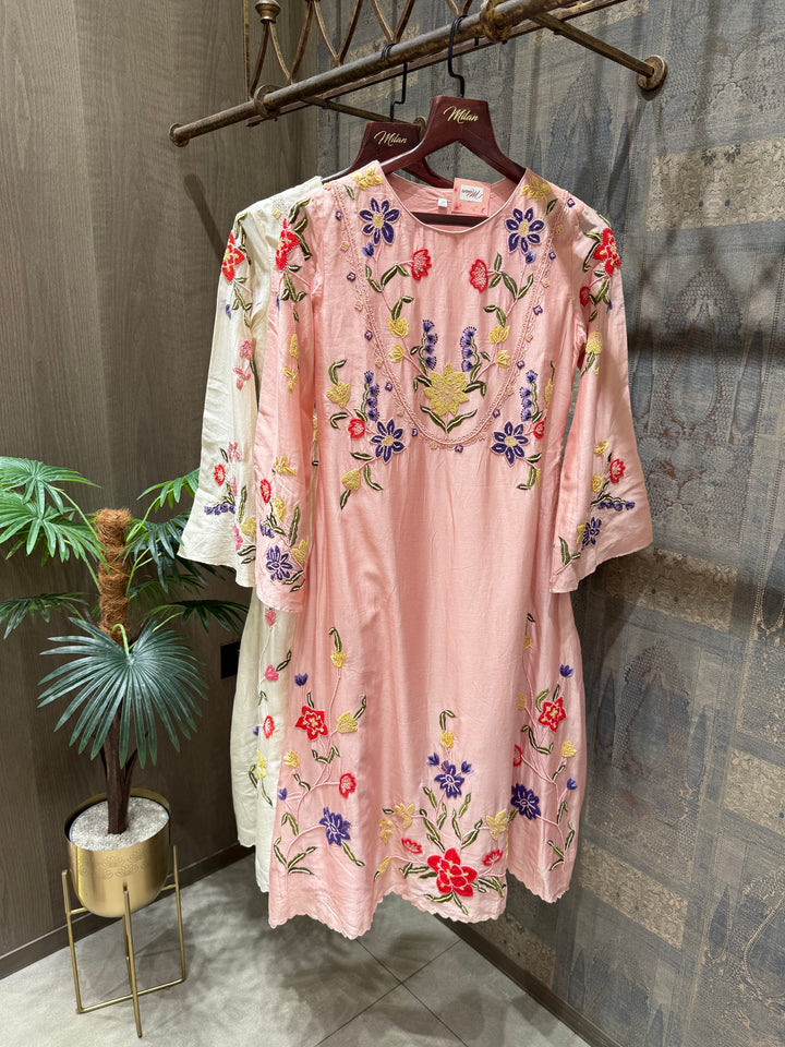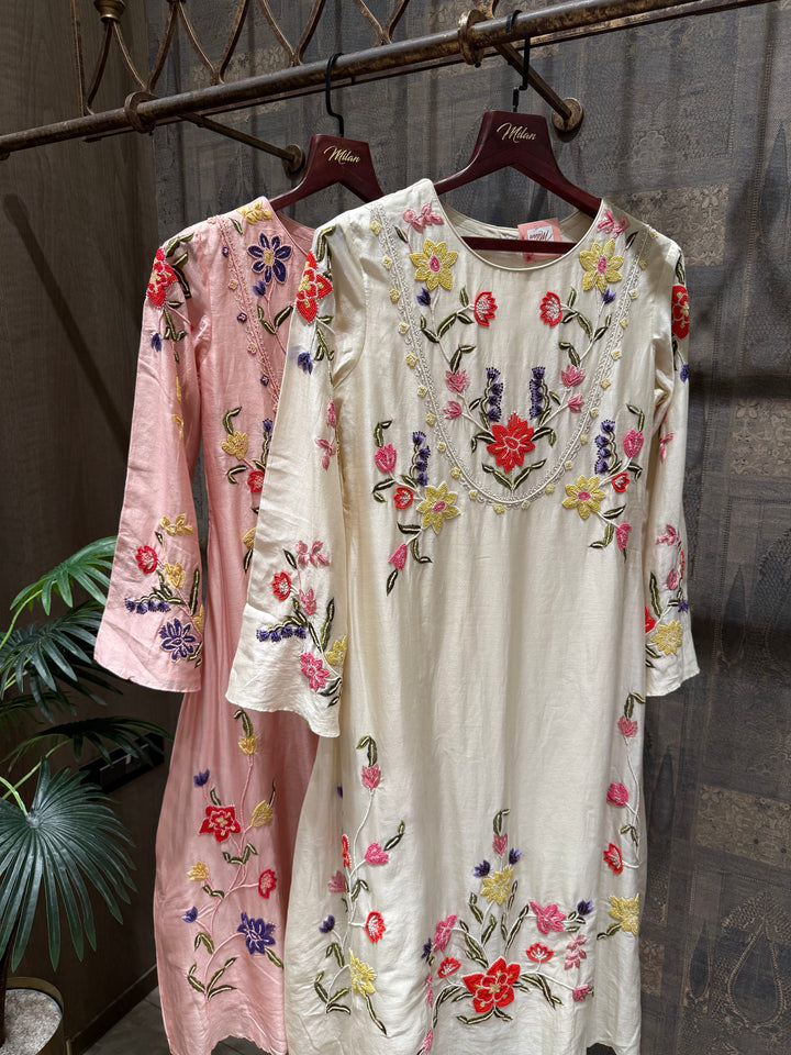 Elegant embroidered kurtas feature vibrant floral handwork in pink, red, yellow, purple, and green.