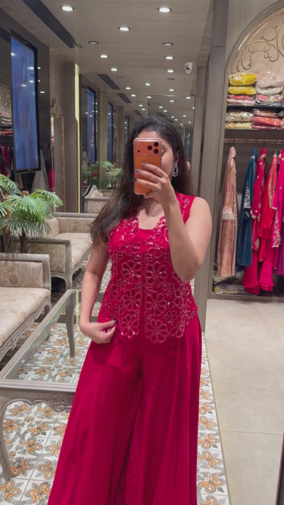 Cut Work Top with complete handwork done on it, on net paired with a flared Pallazo on crepe and crop top within the top in crepe.