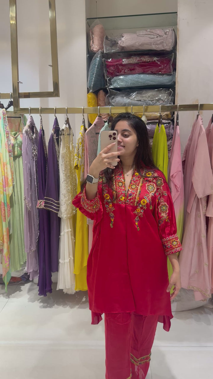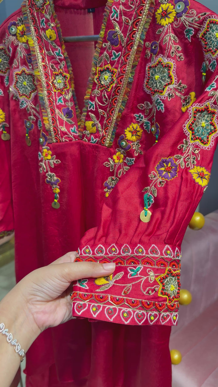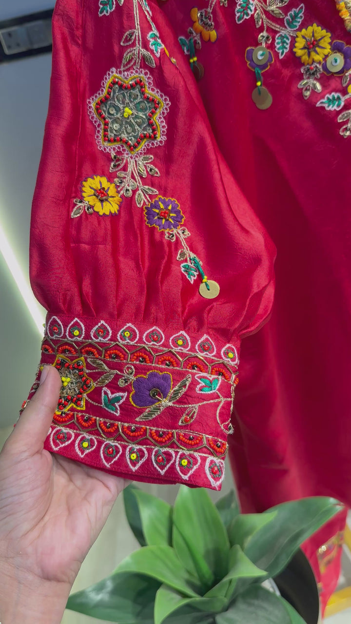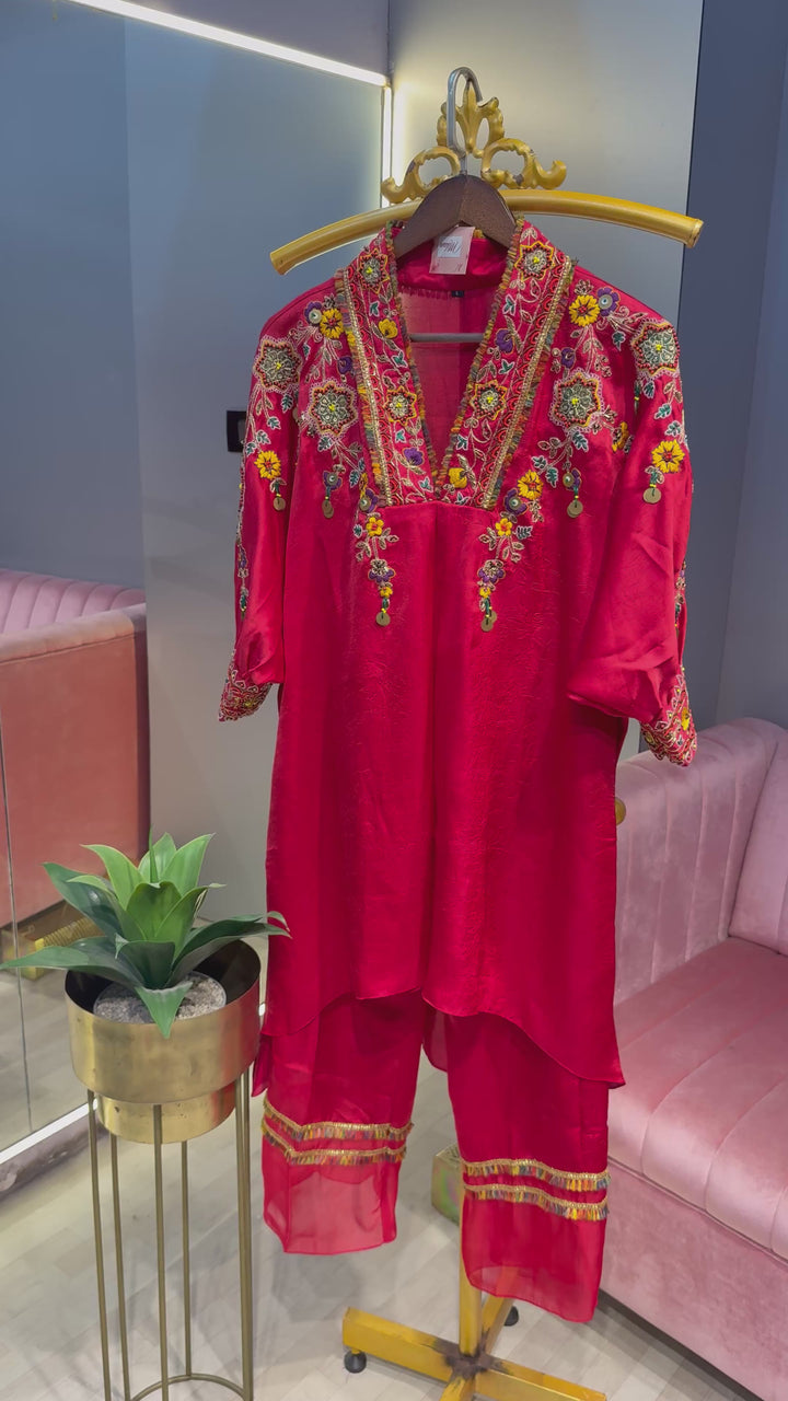 A stunning embroidered set featuring a rich kurta on Dola Silk with vibrant floral thread work and sheer-detailed pants. Perfect for festive occasions and celebrations!