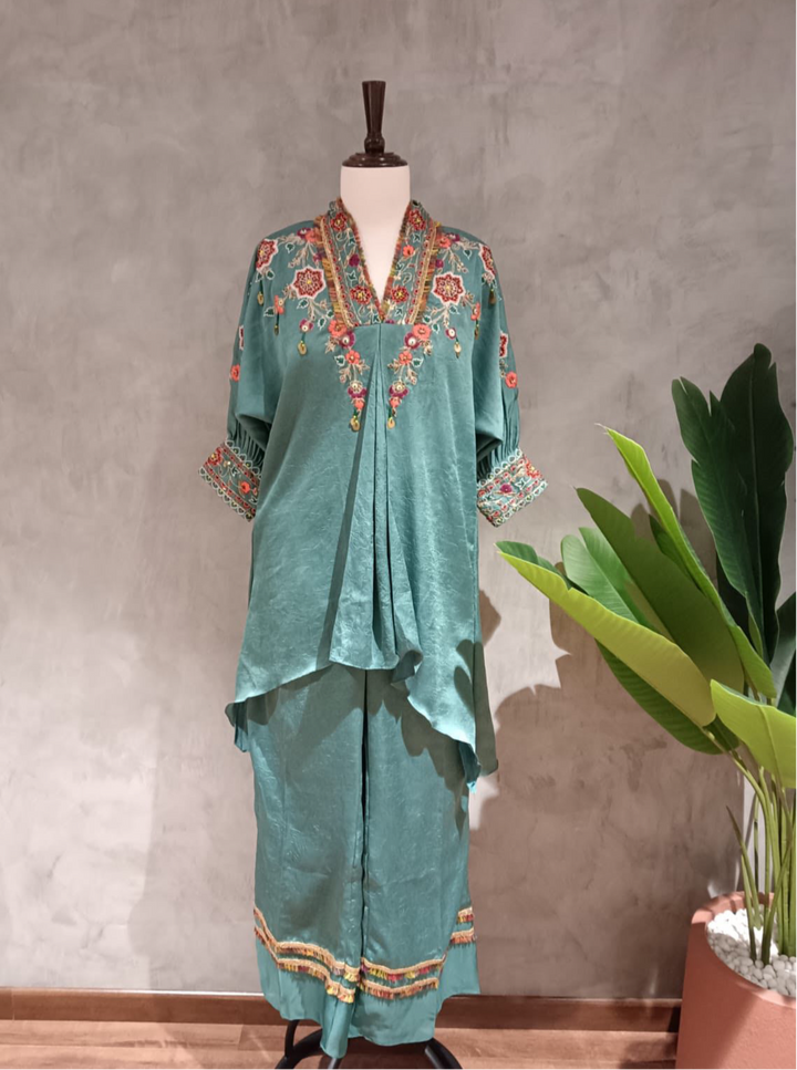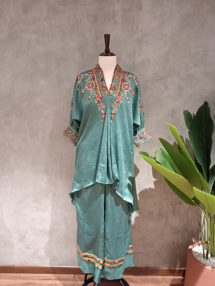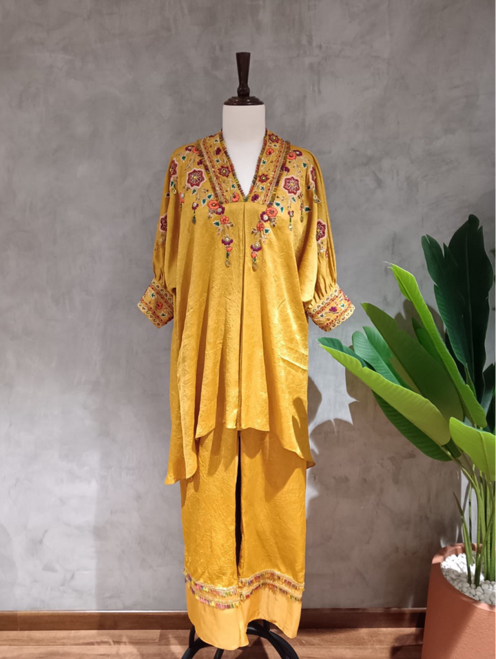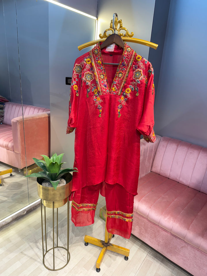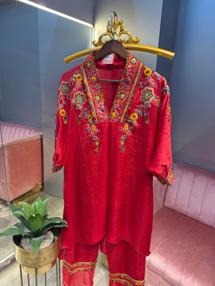 A stunning embroidered set featuring a rich kurta on Dola Silk with vibrant floral thread work and sheer-detailed pants. Perfect for festive occasions and celebrations!