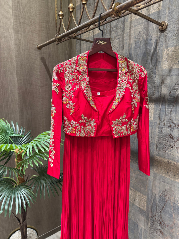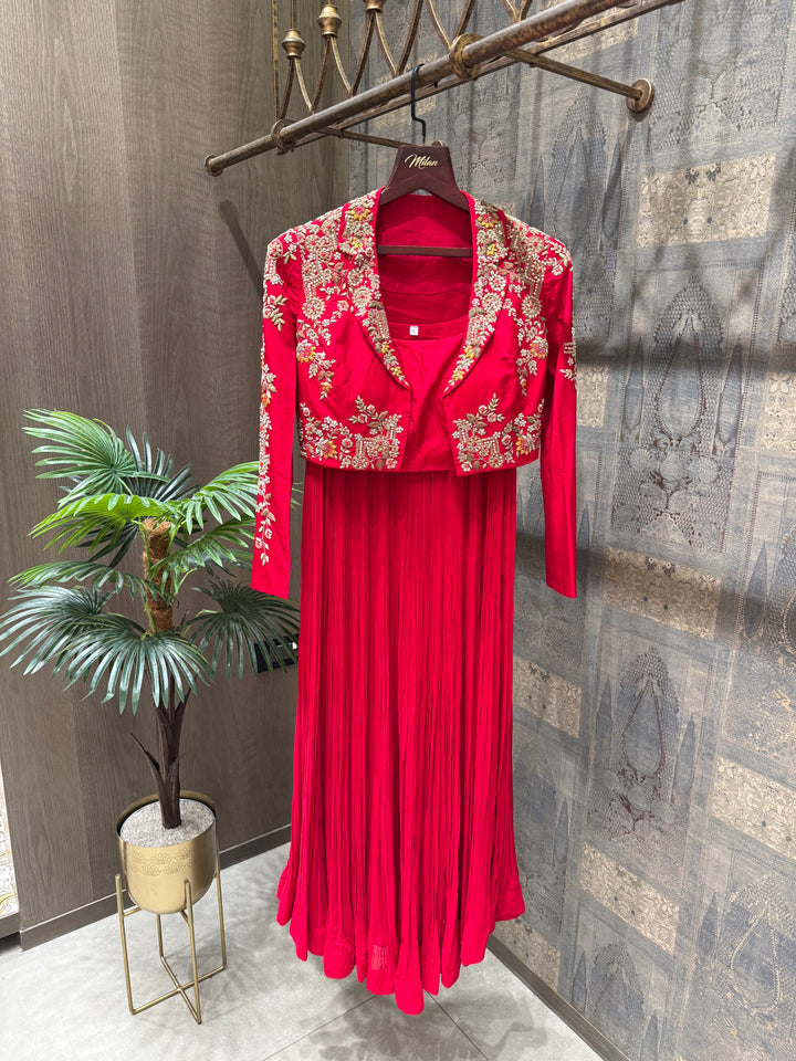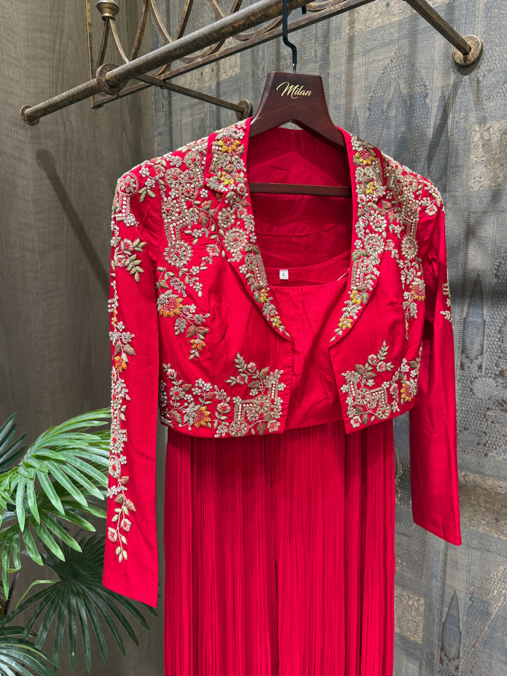 Handworked Short Jacket with crop top paired with a flared Pallazo. Fabric used : Dola Silk