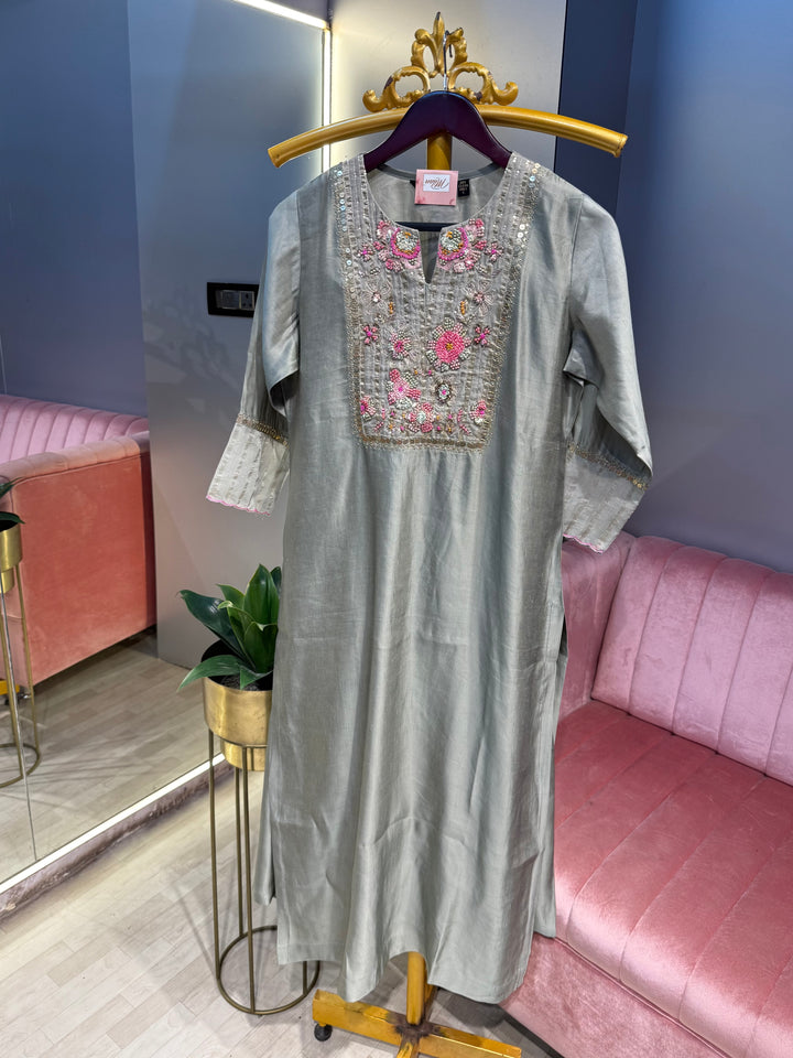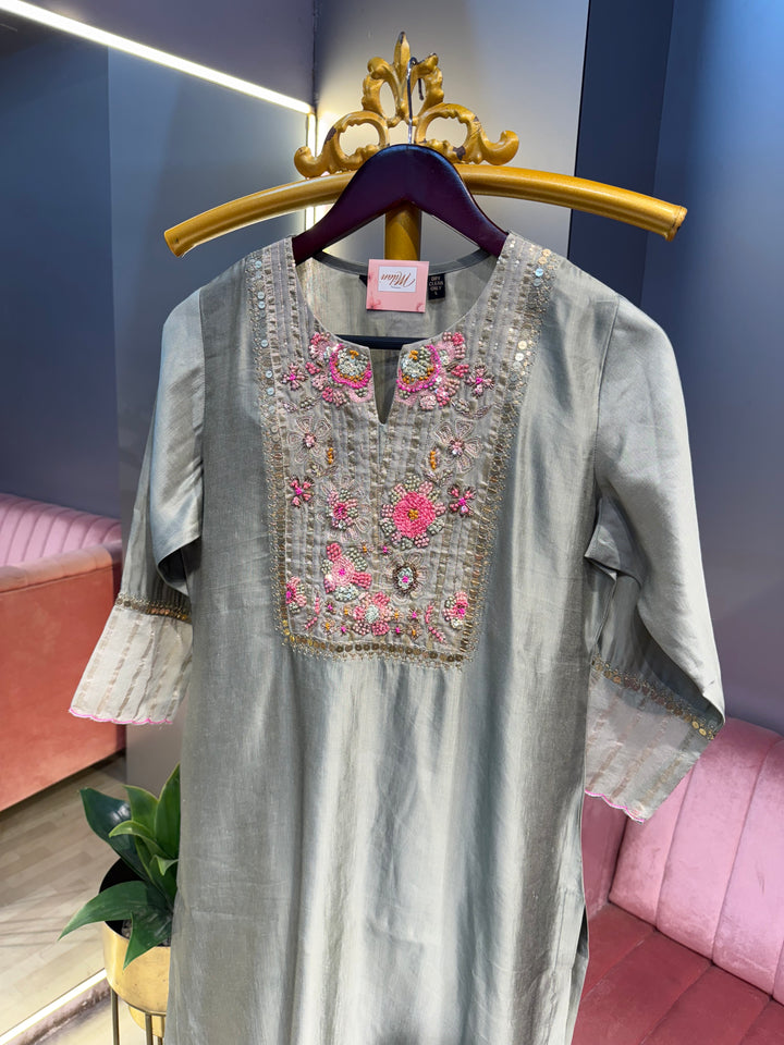 Handworked Kurta set on Pure Tussar Satin Silk with Pant styled bottoms on Pure Tushar Satin Silk.