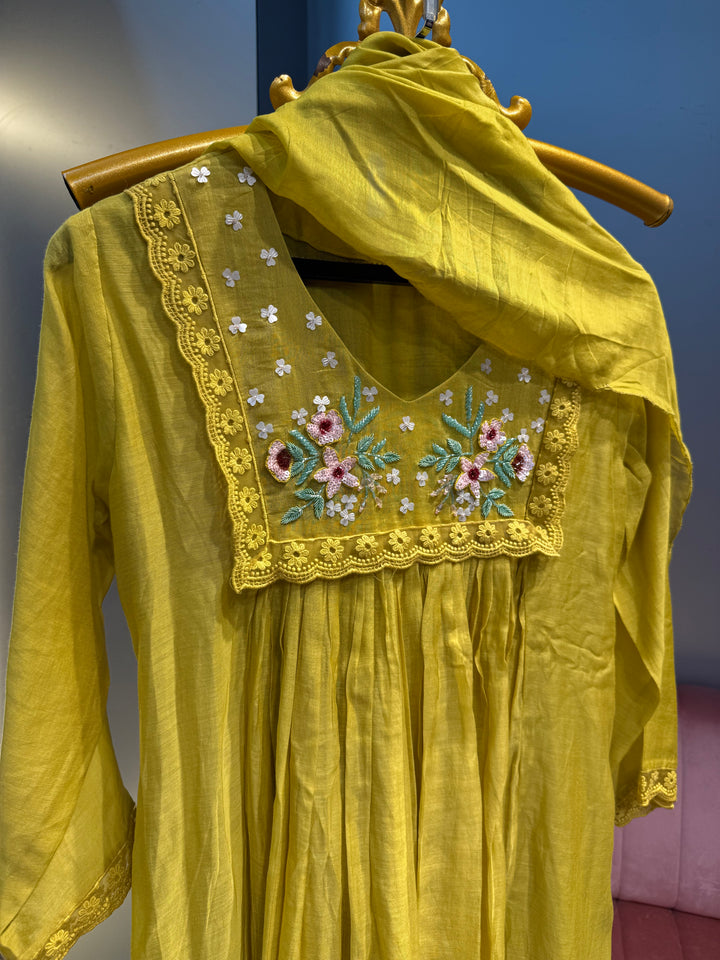 Handworked Kurta on Mul with embroidery on the yoke, paired with mul pants and dupatta.