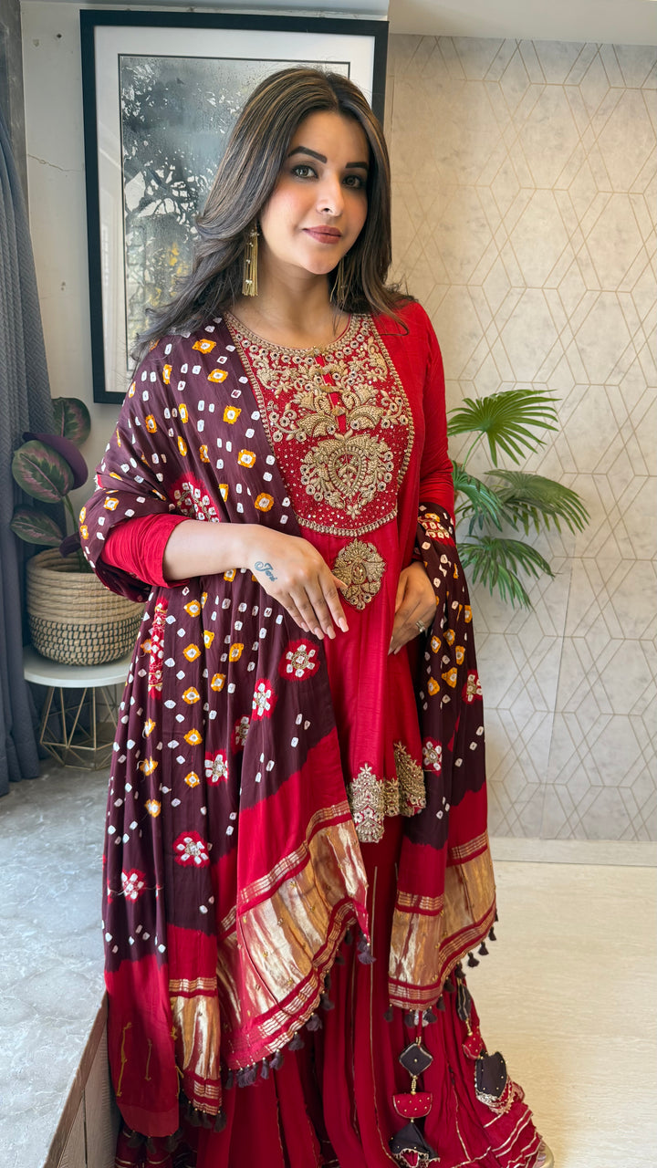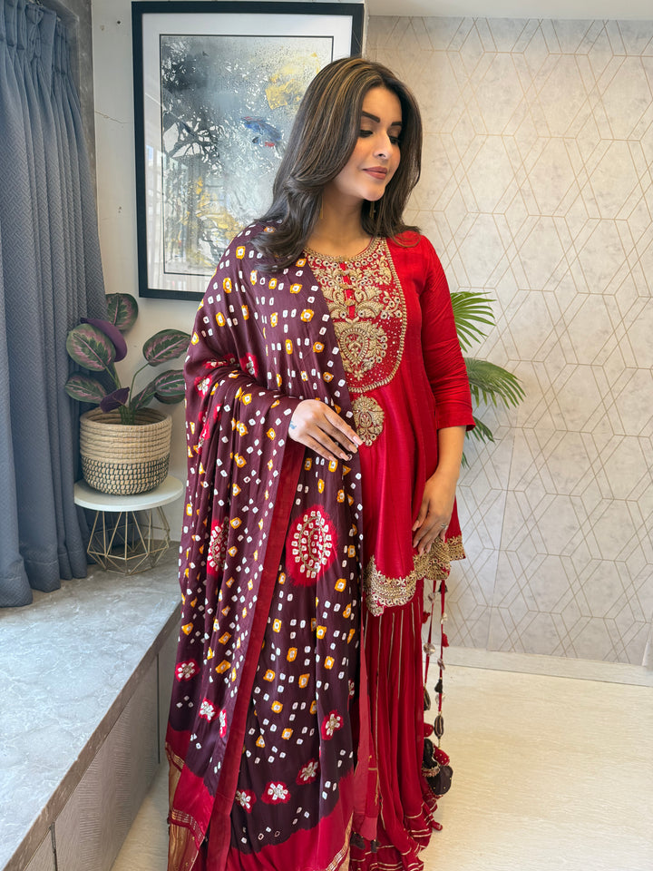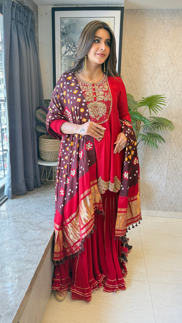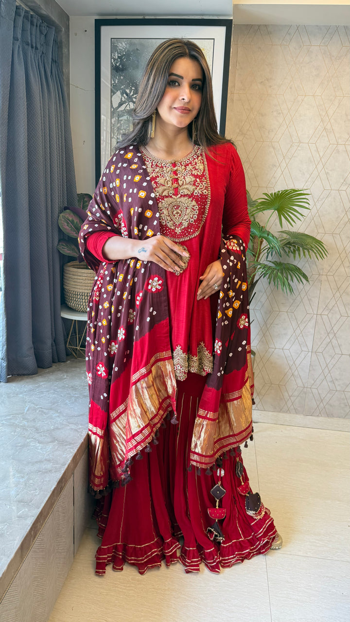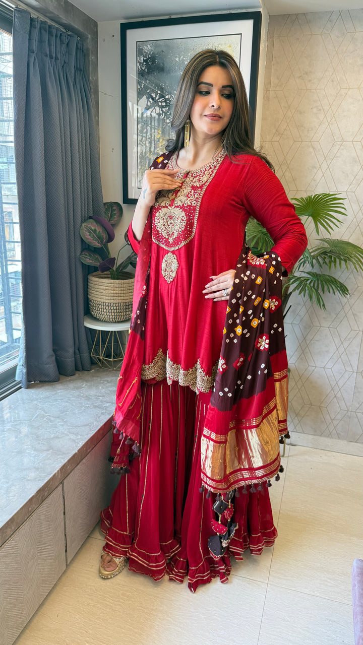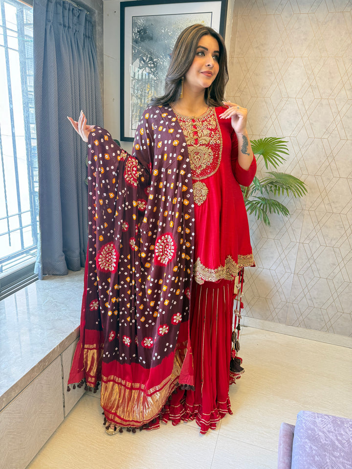 Completely Handworked Peplum on Pure Dola Silk paired with a flared Sharara and Pure Gaji Bandhani Dupatta with Lagdi Patta.