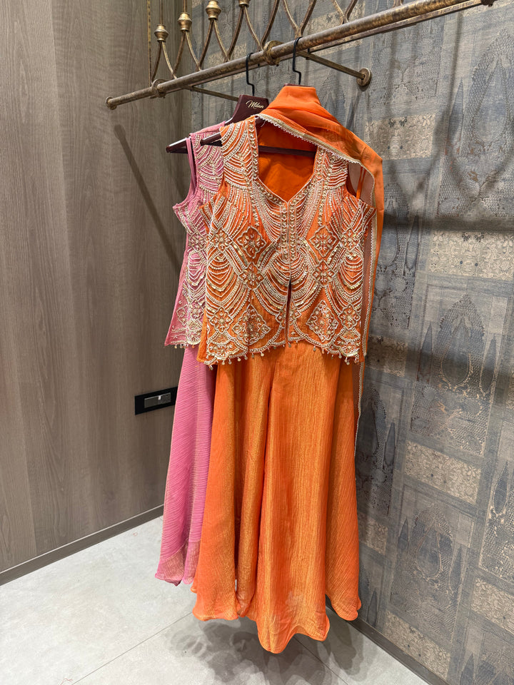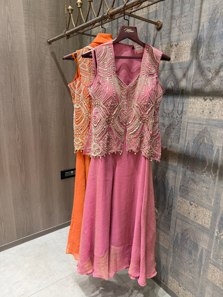 Handworked Short Top with Cut Dana, Tikki and Bead work done on it. Paired with a flared Pallazo.
