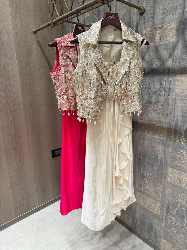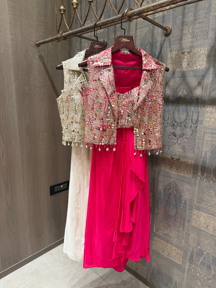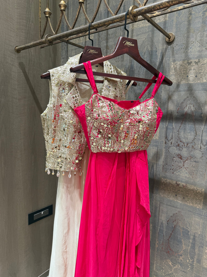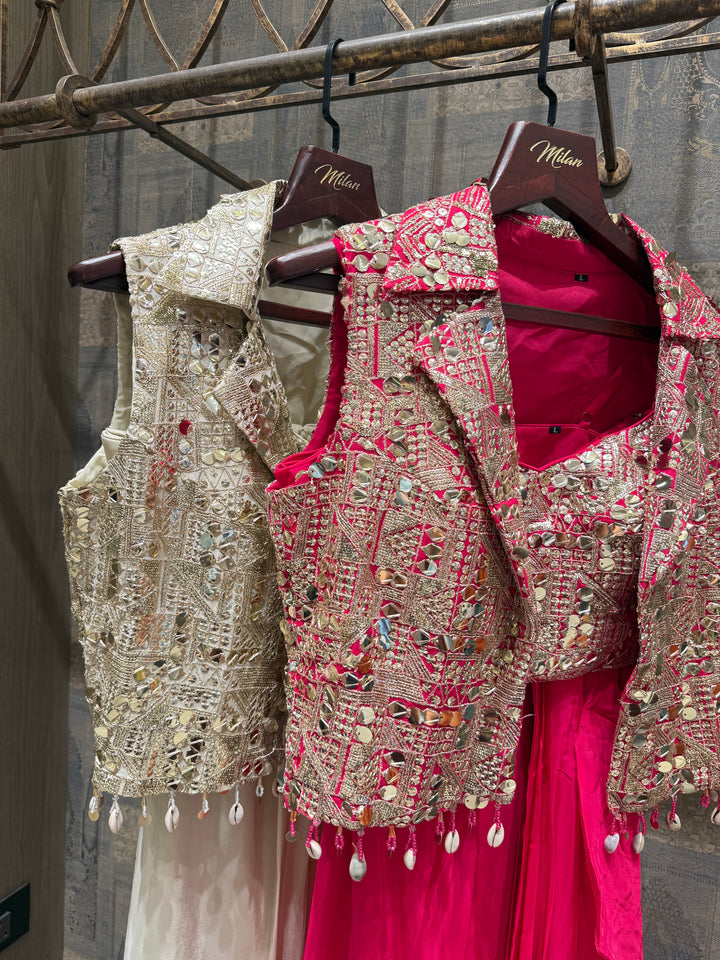 Mirror Embellished Short Jacket and Crop Top on Dola Silk paired with a drape skirt on crepe.